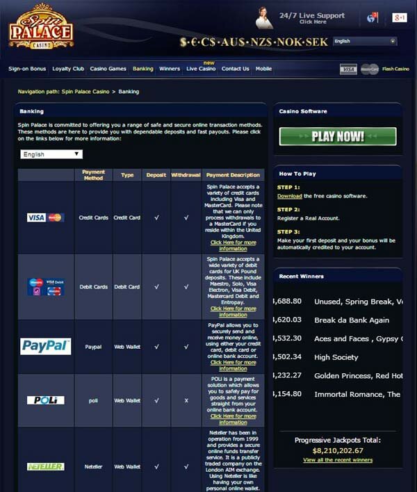 Spin Palace provides extensive banking offers, meaning customers can choose from a wide range of depositing and withdrawing options depending on what account they hold and where they come from.