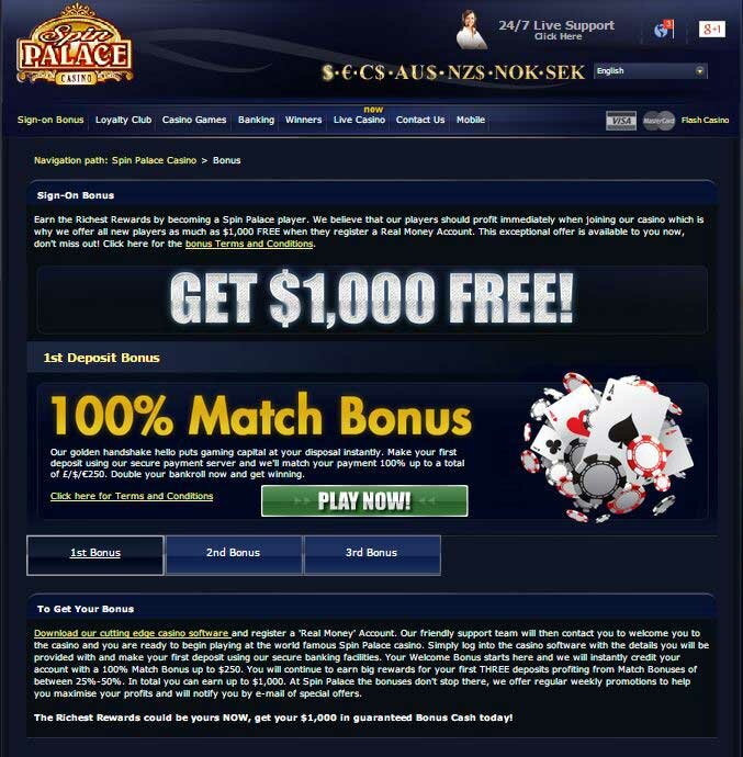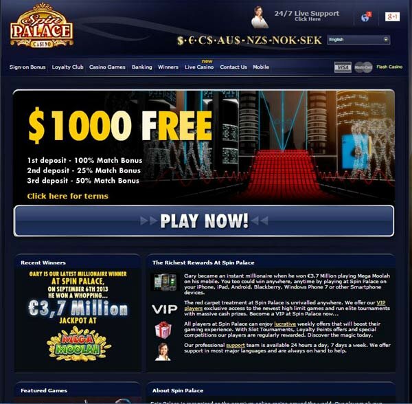 Spin Palace, a download-based online casino, is powered by Microgaming and provides over 400 casino games to choose from. The homepage is of the casino is elegantly stylized with not much focused on the design. After opening the homepage, you are greeted by the large display of signup bonus worth AU$ 1000 that the casino has to offer. The design of the website is more content based and straightforward and has avoided the “spectacular look”.